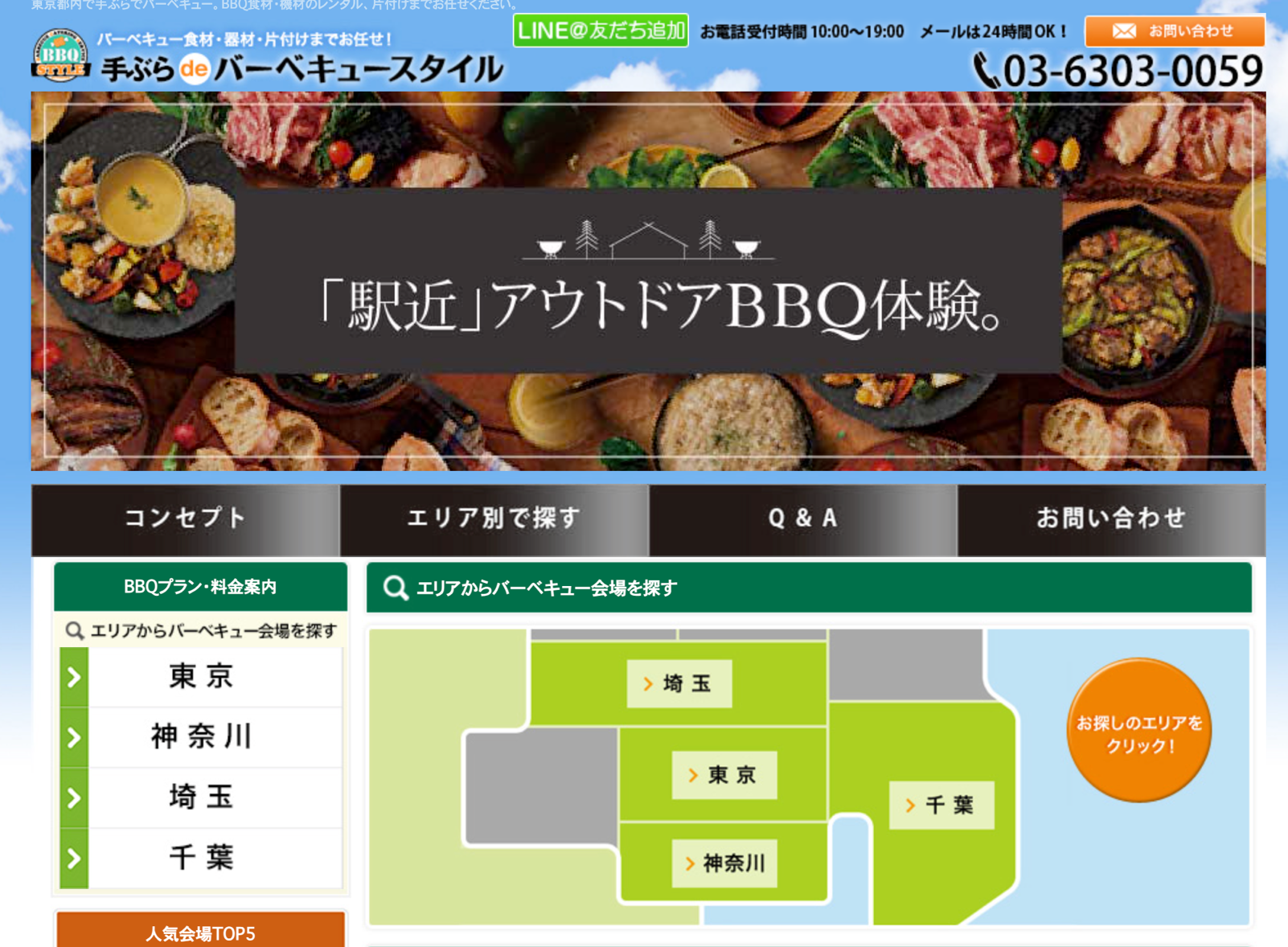 主なサービス・設備 | BBQ器材レンタル、設営・撤去、ゴミ片付けなどのサポートサービスを提供。「電話サポートサービス」で、BBQ会場への行き方案内やスタートから終了までのサポートあり。 |