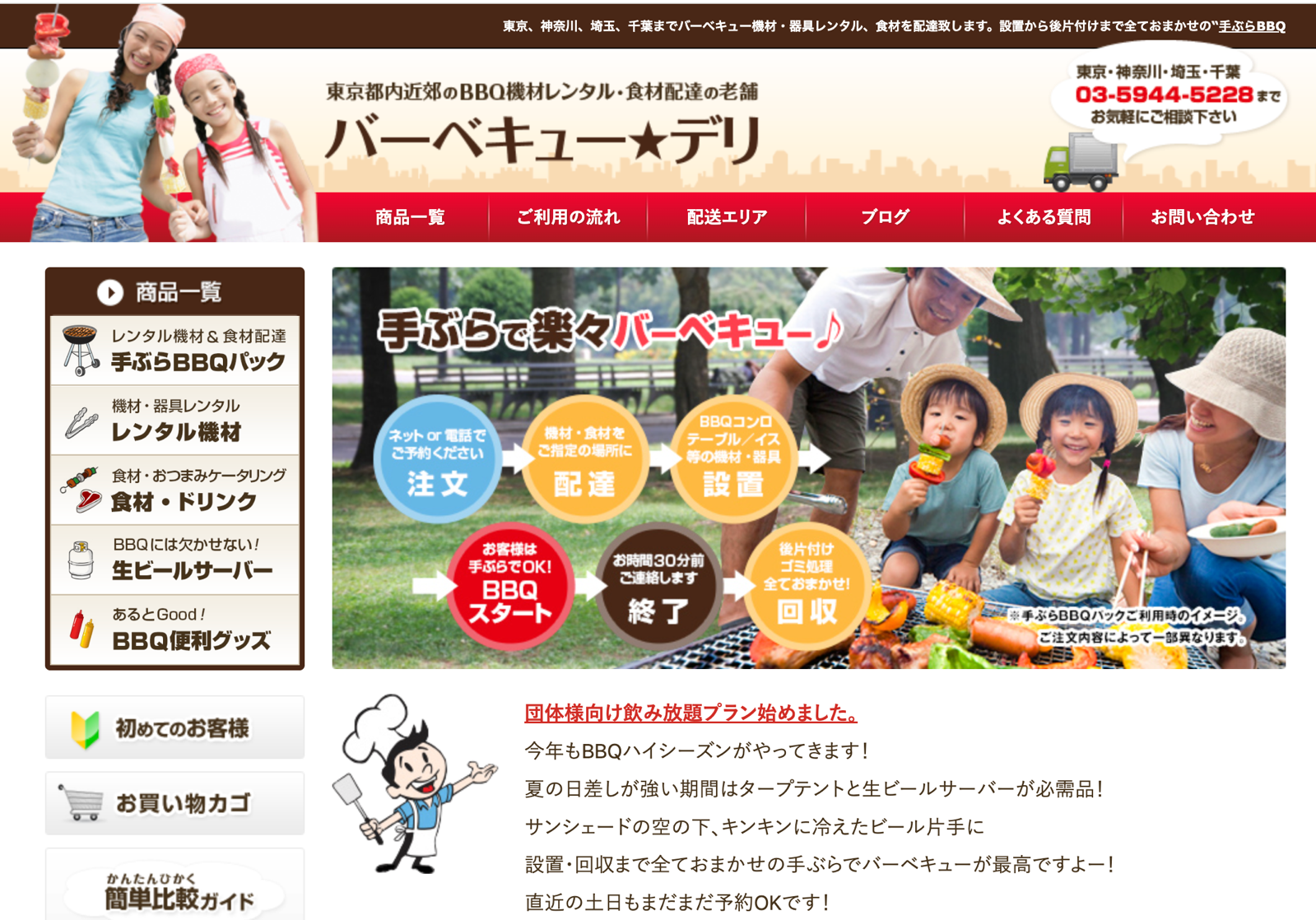 「BBQDeli(バーベキューデリ)」は、株式会社DEEBLUEが運営する関東エリア対応の出張BBQサービスです。機材レンタル・食材配達・設置・片付けまで丸ごと任せられる「手ぶらBBQ」サービスを提供しています。