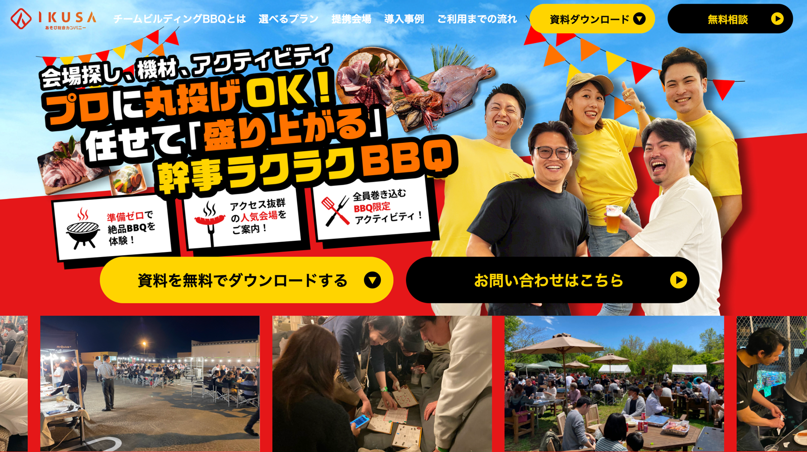 株式会社IKUSAの「チームビルディングBBQ」は、企業イベントを多数手がける企画会社・株式会社IKUSAが提供する出張型BBQサービスです。機材・食材の準備から設営、進行、後片付けまでスタッフがすべて対応するため、準備不要で本格BBQを満喫できます。