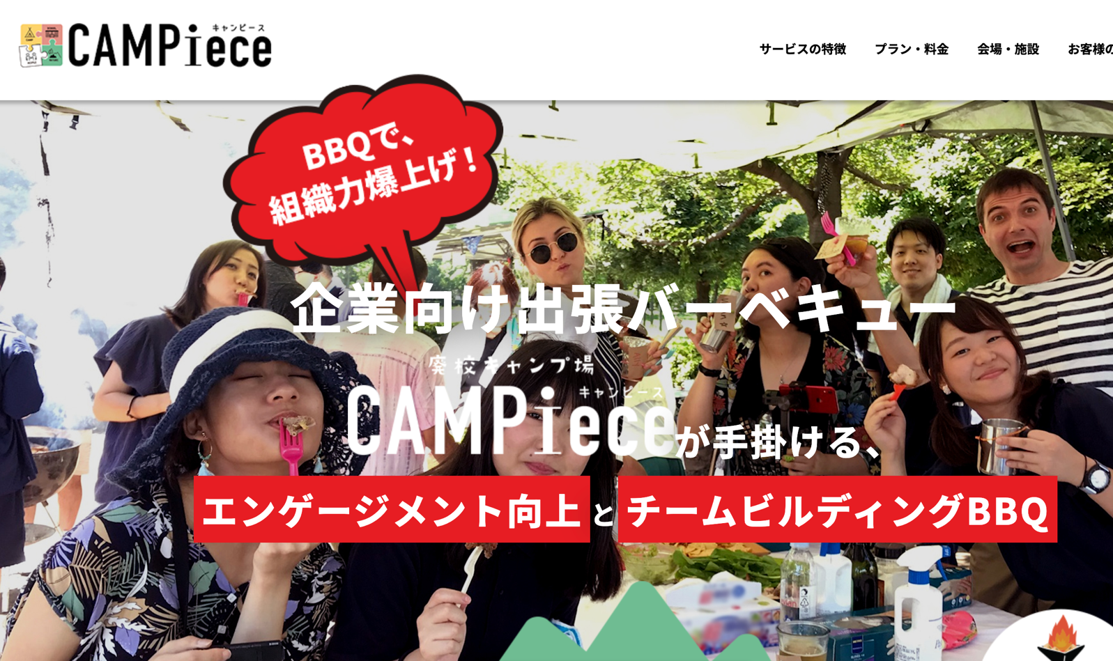 「CAMPiece(キャンピース)」は、 アクティビティも組み合わせた出張BBQサービスです。BBQのみのプランにはアクセス良好な会場を、アクティビティも楽しみたい場合には広い会場というように、要望に応じて、適切な会場の提案をしてくれます。また、廃校を活用したキャンプ施設では、自然のなかで非日常を味わえるのが魅力です。