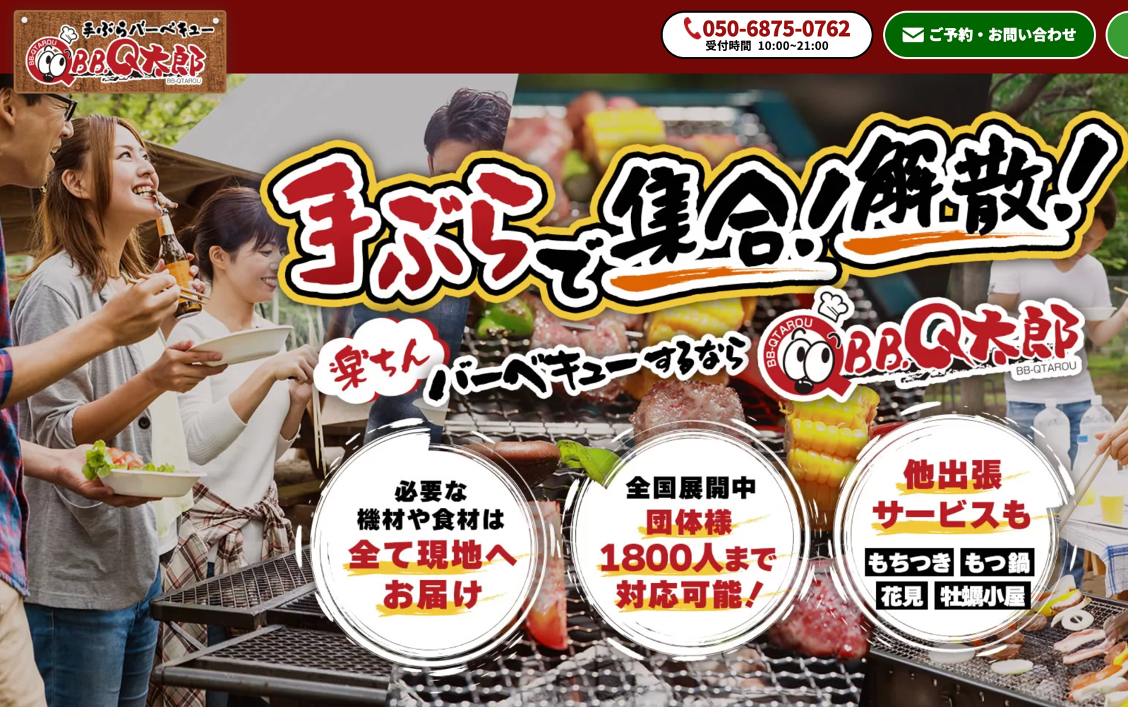 「BBQ太郎」は、全国展開する出張BBQ専門サービスです。機材や食材の準備、設営、火起こし、後片付けまですべてスタッフが対応するため、利用者は手ぶらで本格的なBBQを楽しめます。